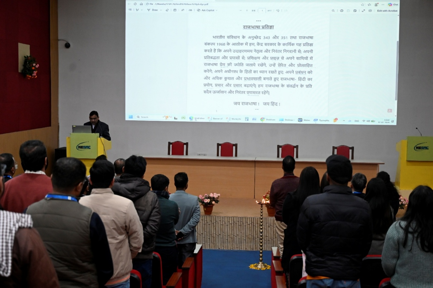 विश्व हिंदी सप्ताह समारोह के दौरान डॉ. एस. पी. अग्रवाल, निदेशक, एनईसैक द्वारा राजभाषा प्रतिज्ञा दिलाना और स्वागत भाषण।